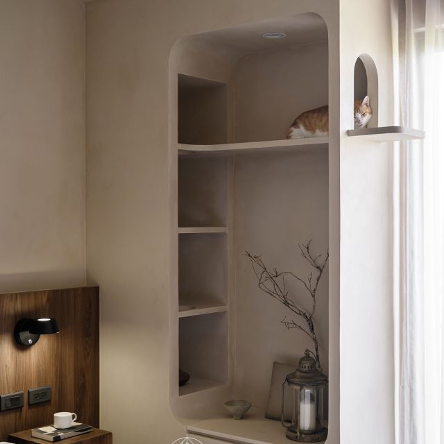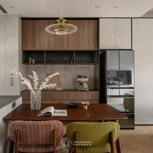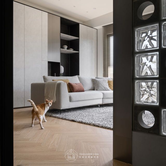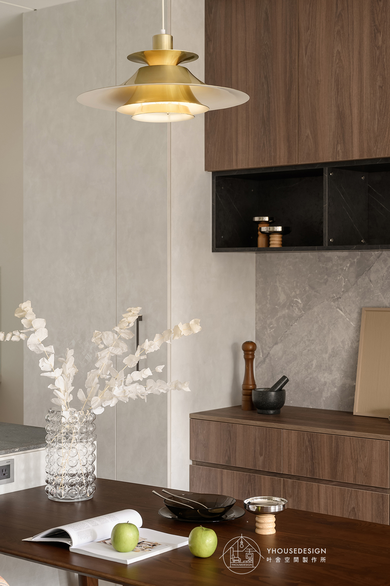 窗外陽光恰到好處的灑進室內,光線穿透過隔屏,蔓延至梯間,金屬面燈具、板材,化身室內中的曙光。